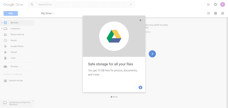 You’ll see the welcome screen. If you’re using a plugin like UpdraftPlus your backups will be stored in a folder in the My Drive tab.