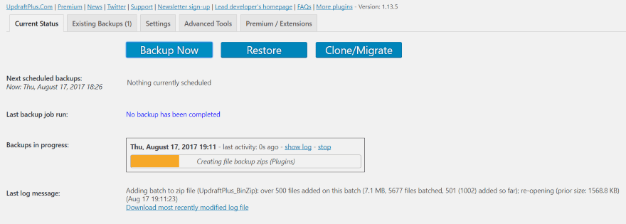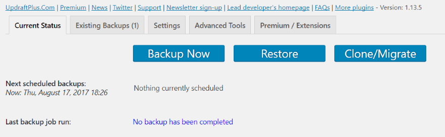 Now it’s time to create the backup. In the UpdraftPlus settings, select the Current Status tab. Here’s where you can make backups manually. You can automate them in the Settings tab. The backup works the same. Click Backup Now.