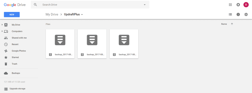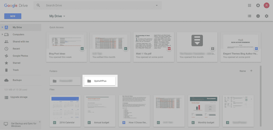 To see the see the backups in your Google Drive, go to your Google Drive account and select the UpdraftPlus folder.