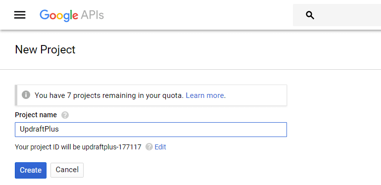 Enter a name for the project and select Create. Once the project is completed (the notification in the upper right will let you know), click the Google APIs logo to go to the API File Manager.