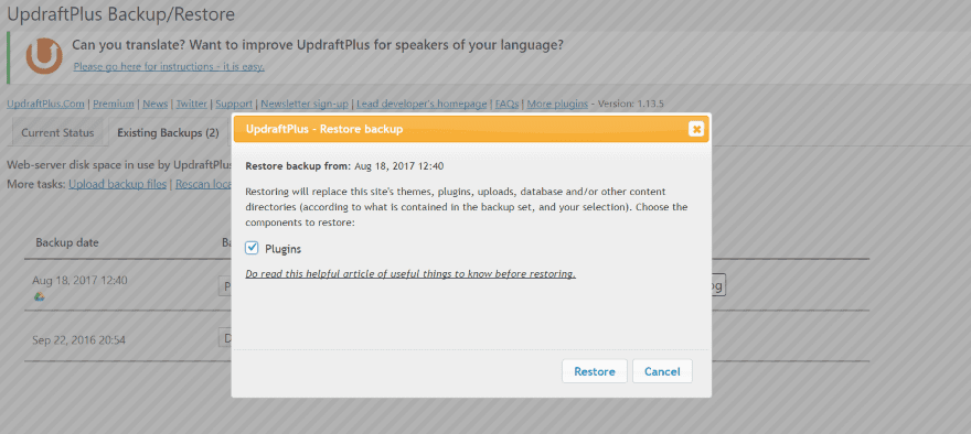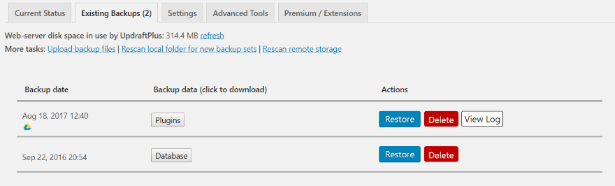 Selecting Existing Backups shows the backups you’ve created. If it’s stored on the Google Drive you’ll see the Google Drive icon under the date. In this example I have an old backup that’s stored on the server and a new backup (just of plugins) that’s stored on my Google Drive.