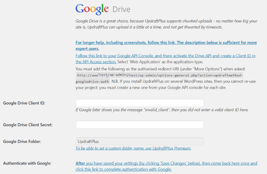 Under the storage options you’ll see the Google Drive settings. You’ll need your Client ID and Client Secret. To create these, go to the API Console. The instructions are provided in the two links (“For longer help…” or “Follow this link…” and create the API. I followed the instructions from the first link.