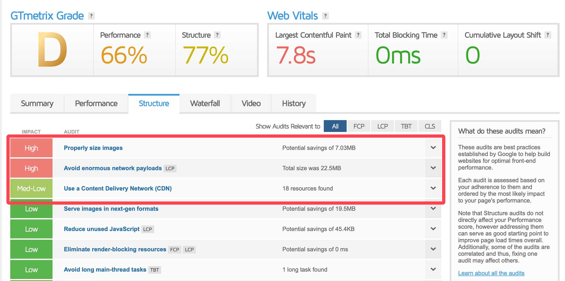 We can gain insight into what is causing our site to load so slowly on the structure tab. As you can see, we have several images that are way too big, causing our page to load slowly. In addition, a few large network payload issues due to javascript files that are hogging resources.