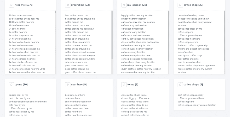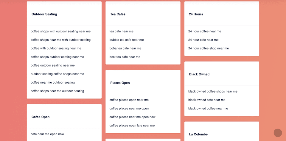 The keywords are grouped by topic, with a cluster of search terms underneath. This makes it easy to weed out topics and keywords that you don’t care about – much easier than if you were to try to pare down the main list you start with. You can immediately get rid of clusters that don’t pertain to you, like “Open Late” if you run a coffee shop that closes early, for example. The results are also downloadable as a simple CSV with only two columns: Group (the main topic) and Keyword (the keywords in the cluster).