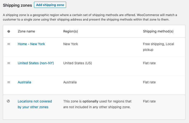 - Shipping Zone: Geographic region with a specific set of shipping options. WooCommerce will show shipping methods to a customer based on their shipping address.