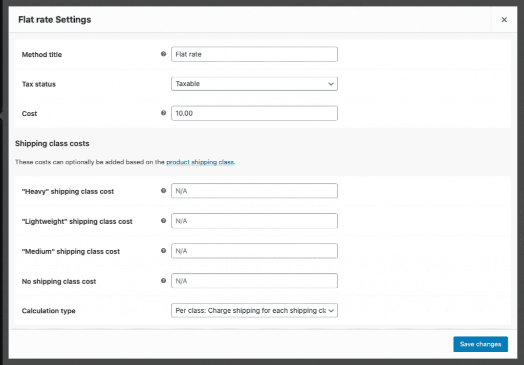 You’ll have to go back into your shipping zones to set flat rate costs per shipping class. Click “Flat rate,” then set each class’ shipping cost. (To make this whole process flow better, set your shipping classes first, before setting up shipping zones.)