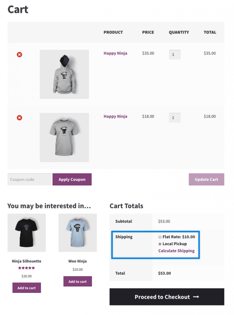 You can give customers the option to pick up their products at no cost instead of having them delivered. Here’s what checkout will look like to the customer: