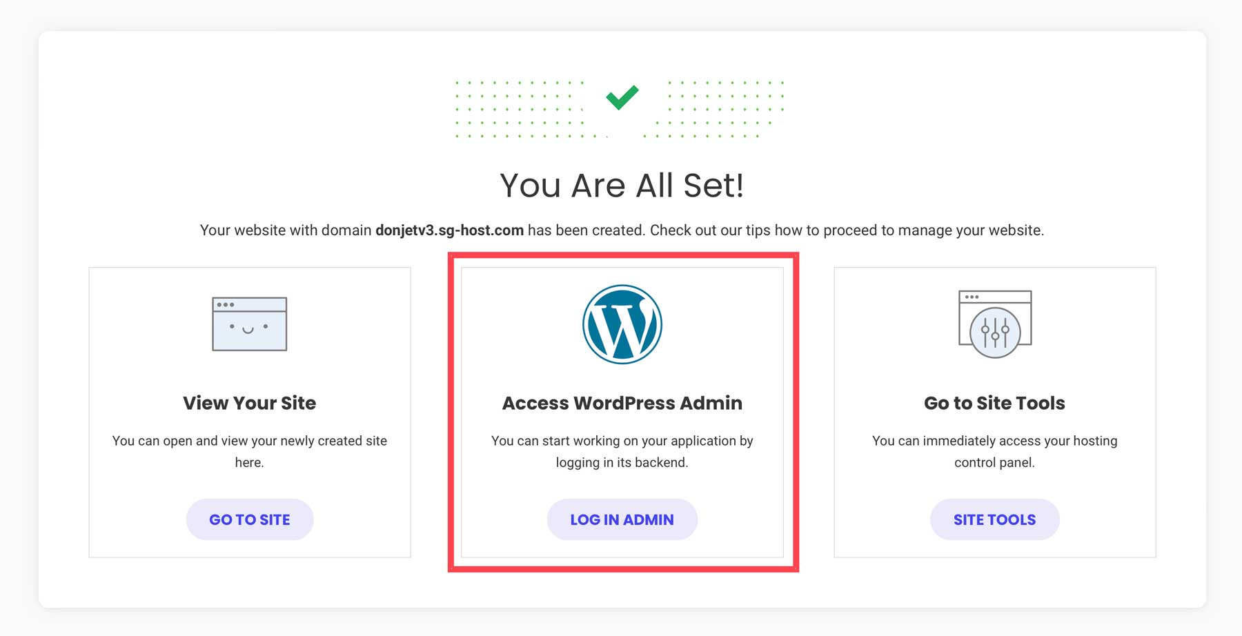 You have two choices in accessing the WordPress dashboard. Through SiteGround, you can click on the log in admin button.