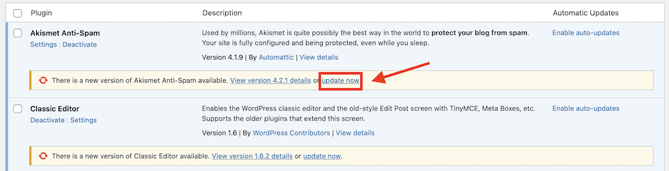 You can also set plugins to automatically update. In the screenshot below, the first plugin is already set to auto-update, while the second one still has the option that can be enabled.