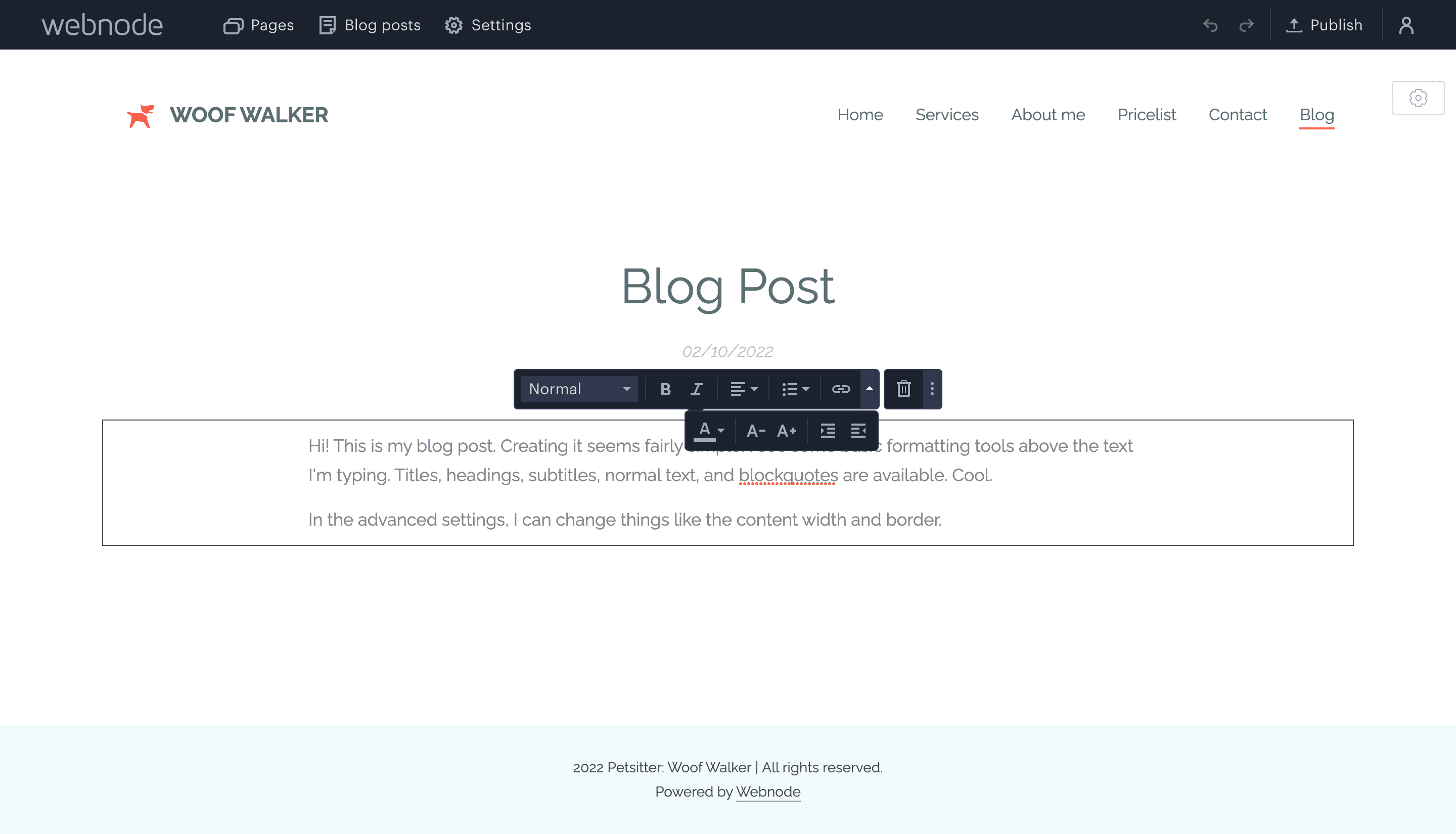Webnode pages and blog posts can be published from within the dashboard. If you want to add a blog post, Webnode allows you to edit it right on-page. Type directly into the template to add your copy. Then you can schedule and publish simple blog posts. This is different from the Gutenberg block editor in that you don’t see the changes in real-time. In WordPress, you have to adjust the pages and posts through previews and tweaks, but in Webnode, what you see is what you get (even though it’s not a WYSIWYG editor like the WP classic editor).