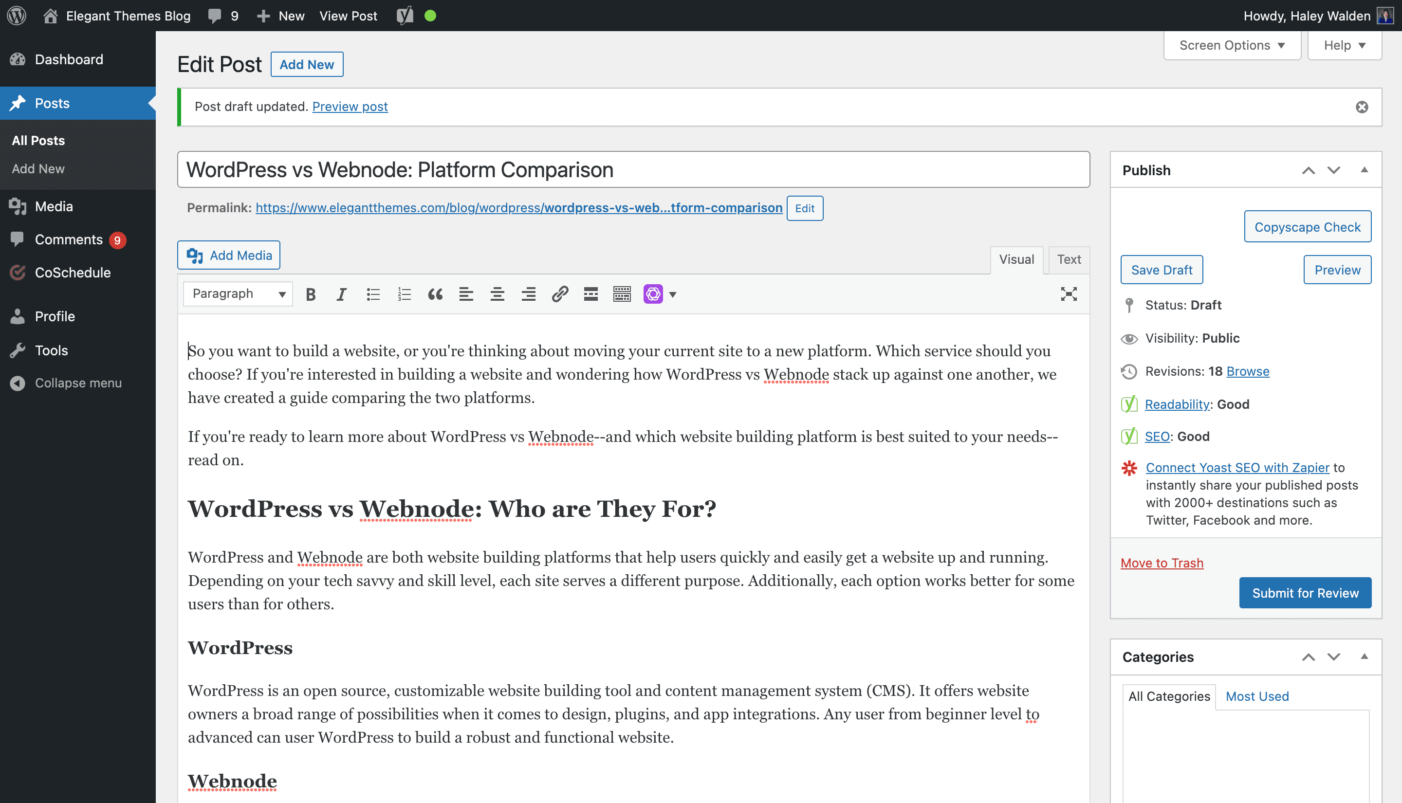 When you publish on WordPress, you have the ability to schedule a post ahead of time, assign categories and tags, set a featured image, and optimize for SEO. Plugins such as Yoast help users fine-tune SEO and readability. Features can be toggled on and off within the editor itself.