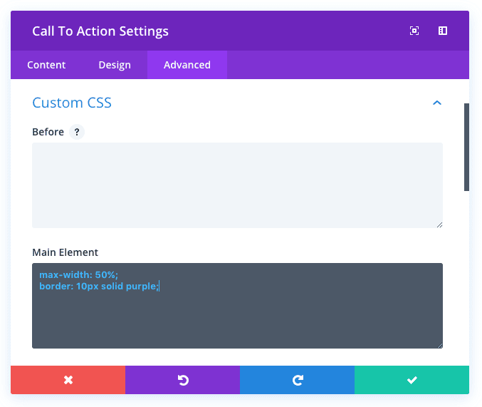 In the Design tab, we have created so many options that you can do just about anything that can be done with CSS (without touching a line of code). If you are a developer, however, you might prefer to write your own code instead of using our custom design controls. In this case you can use the Advanced tab, which can be found right next to the Design tab in the modal settings window for modules, rows and sections.