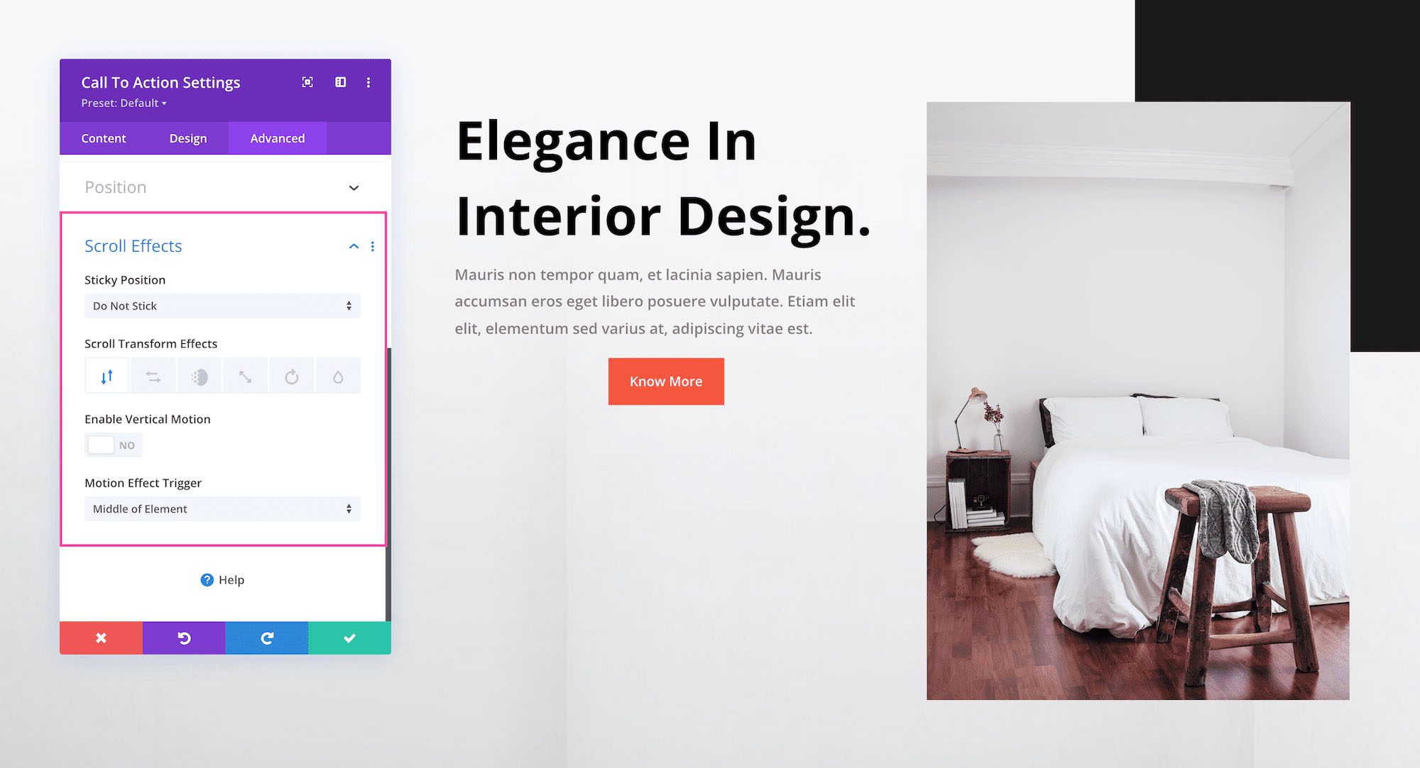 This defines how the module behaves upon scroll. You can make the module sticky (to top, bottom, or top and bottom), and choose if the module transforms upon scroll. You can also enable vertical motion on this module which allows you to adjust the speed at which this element scrolls (making it faster or slower) without affecting the surrounding elements. The Motion Trigger Effect allows you to choose when the scroll effect you just applied is triggered: when the top of the element is in view, the middle, or the bottom.