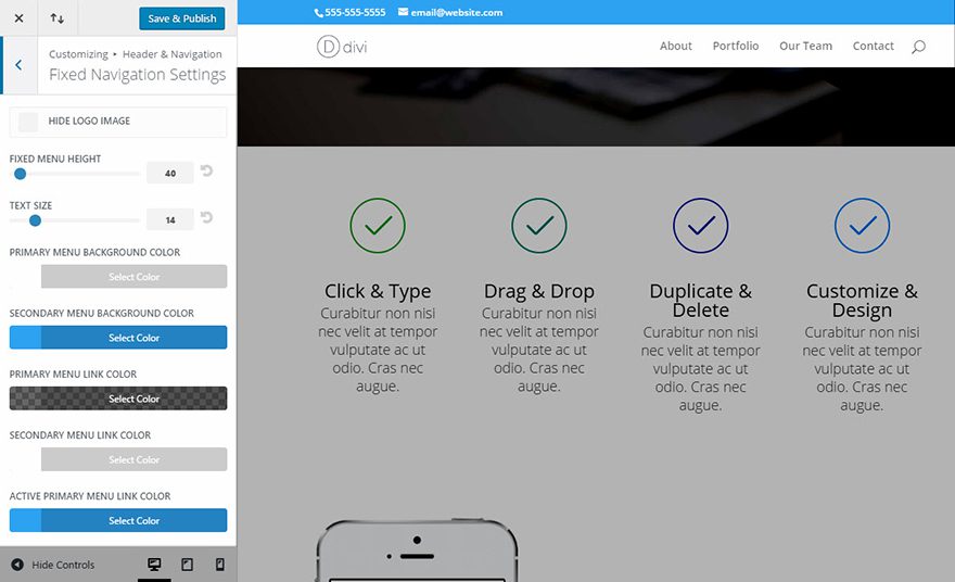 By default, your navigation bar remains “fixed” at the top of your screen when scrolling down the page. this is referred to as your fixed navigation bar. You can style the fixed navigation bar using these settings.