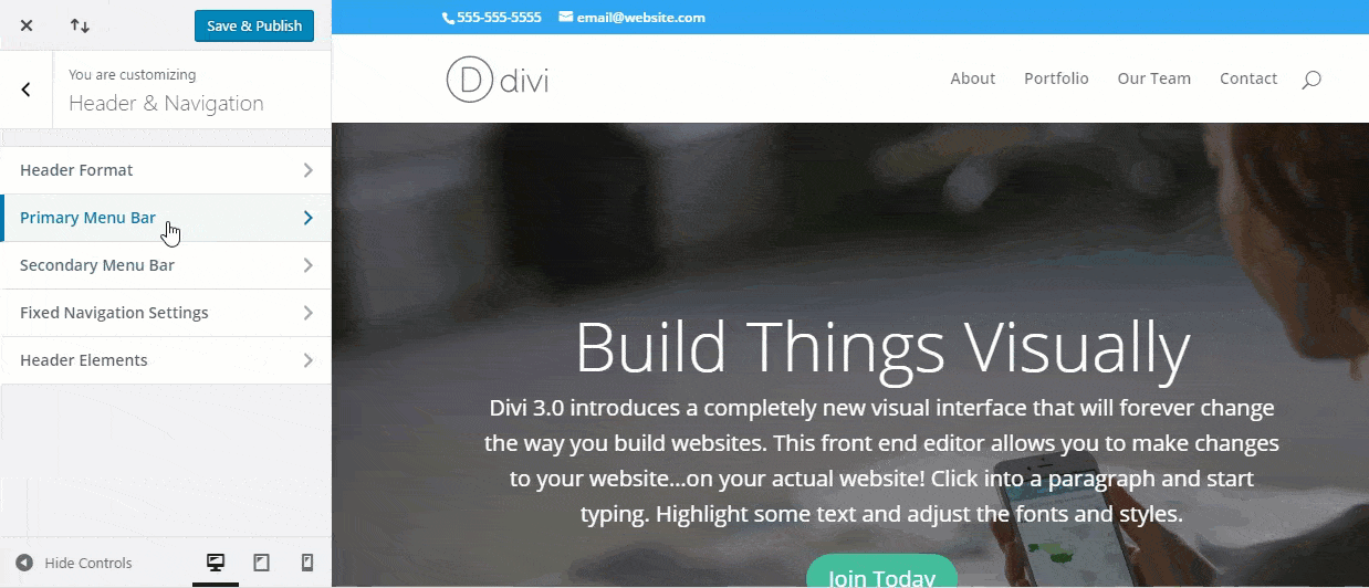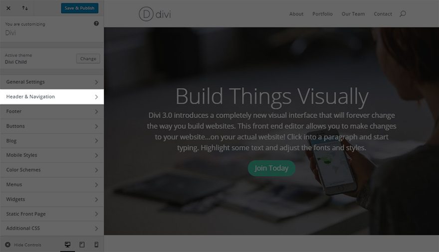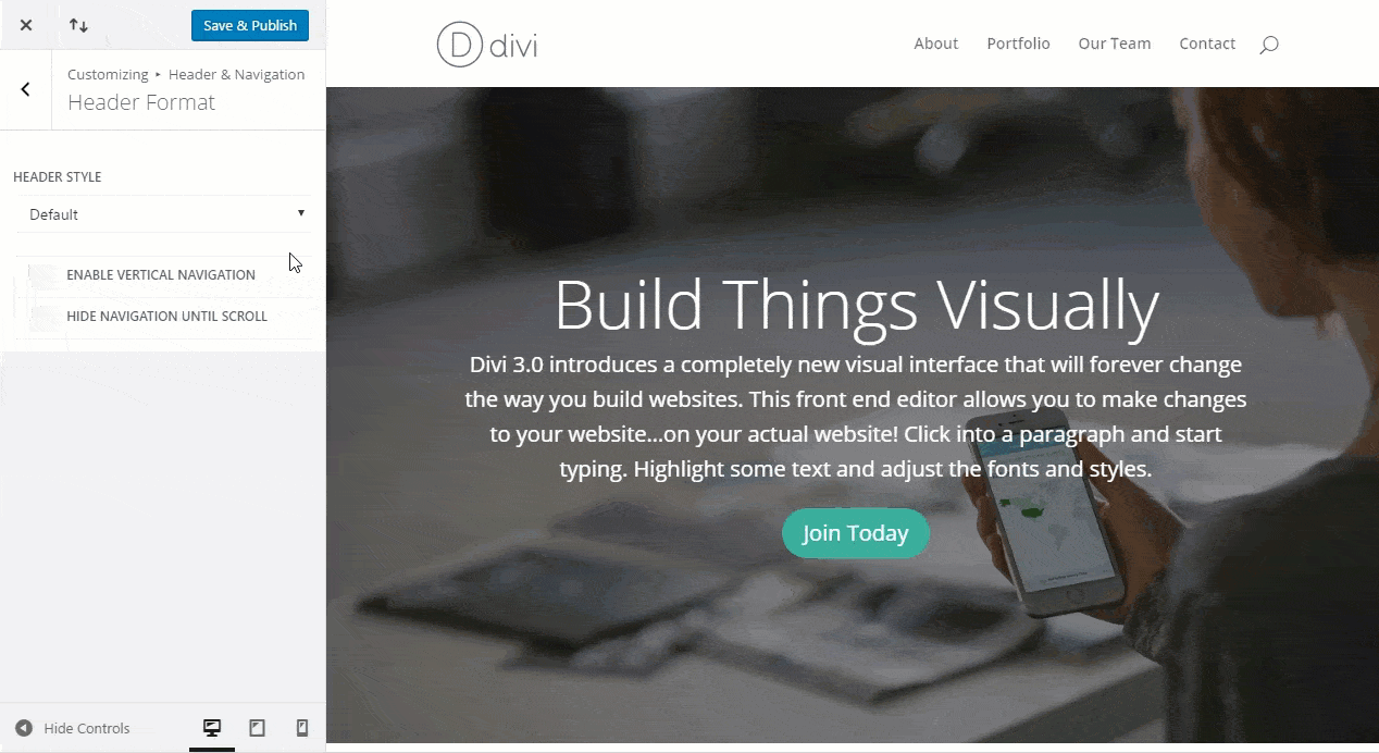 The “Hide Navigation Until Scroll” setting makes it so that your primary and secondary navigation bars will be invisible until a user begins to scroll down the page.