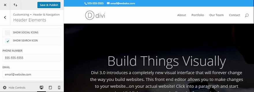 You can also toggle the search icon on and off. If you would not like to allow your visitors to search your website, or if you are simply trying to reduce clutter in your header, then the search icon can be turned off using this setting.