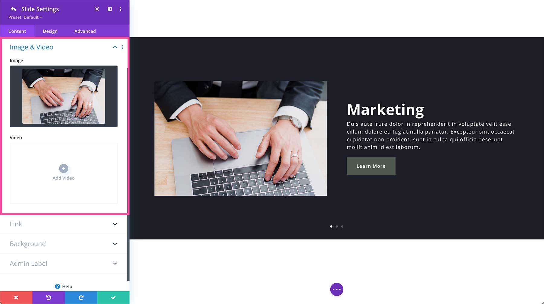 Once added, the module settings automatically pop up. This is where all of the content and design styles for this module are configured. These settings are organized into three groups via the tabs at the top of the module: Content, Design, and Advanced.
