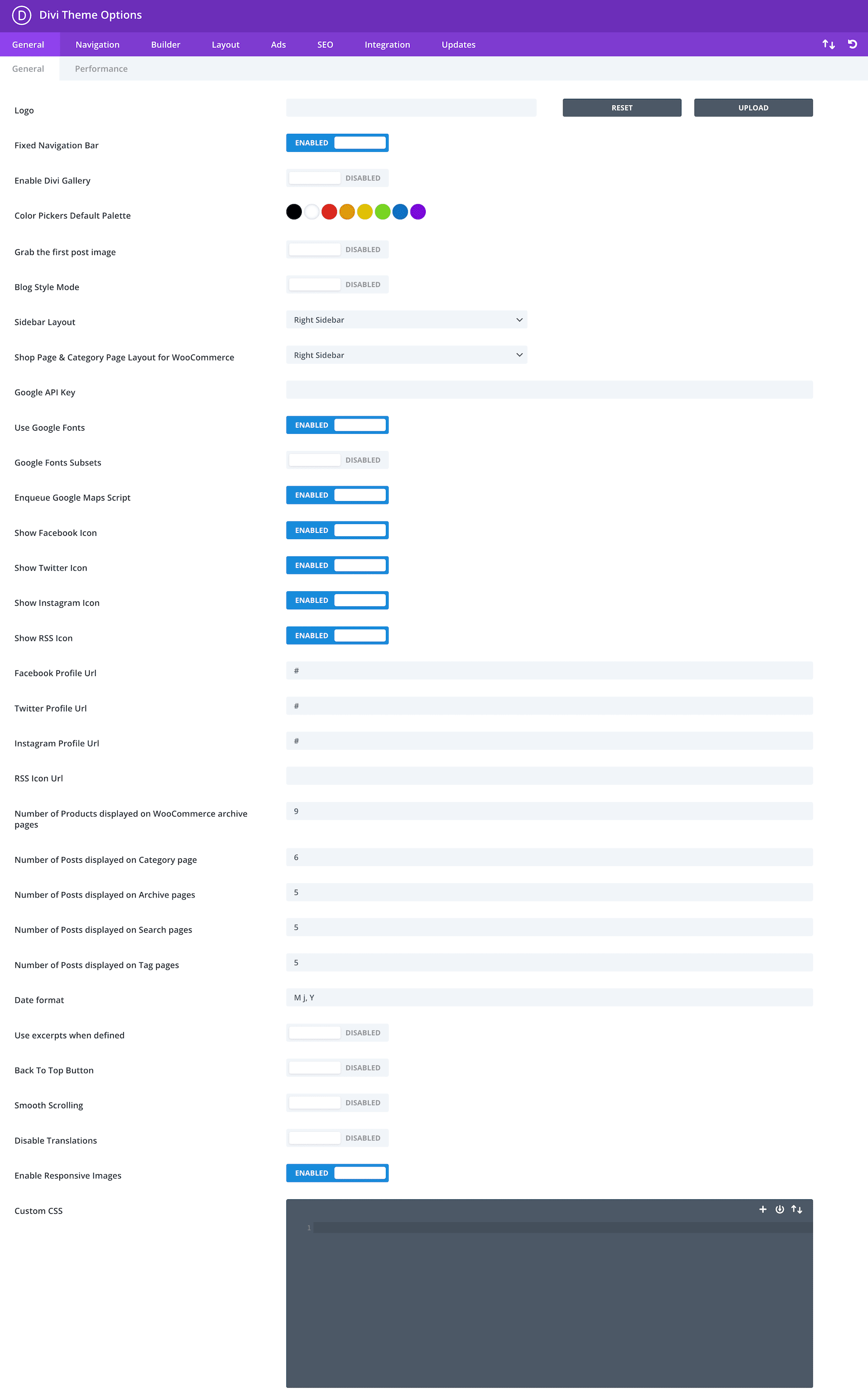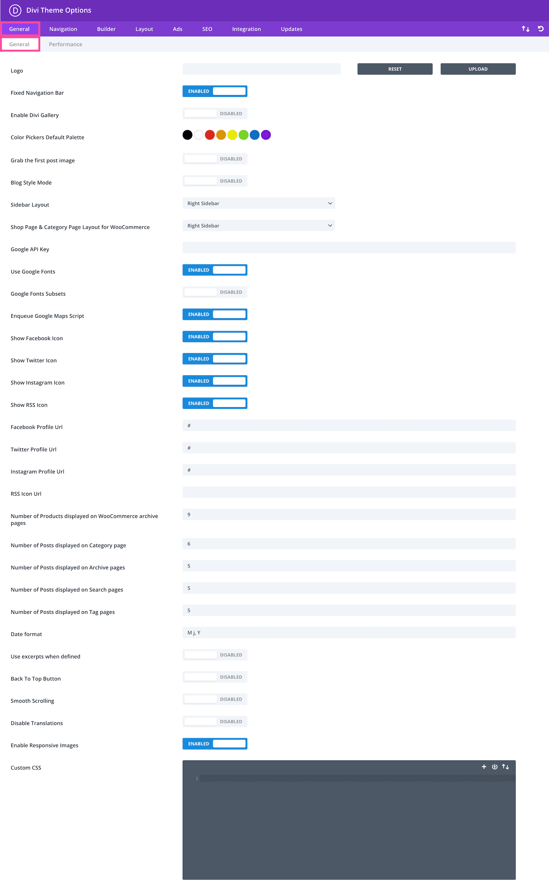 In the General sub-tab, you’ll find general settings options for things like your site’s logo, color palette, social media links, Google fonts, back-to-top button, a custom CSS block where you can add custom CSS to your theme, and more.