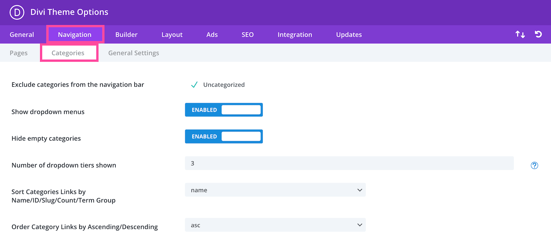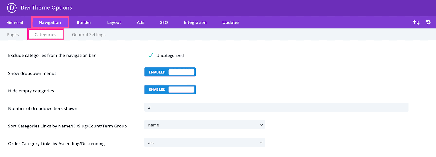 In the Categories sub-tab, you’ll see settings like excluding certain categories from the navigation bar, hiding empty categories, specifying the order of categories, and more.