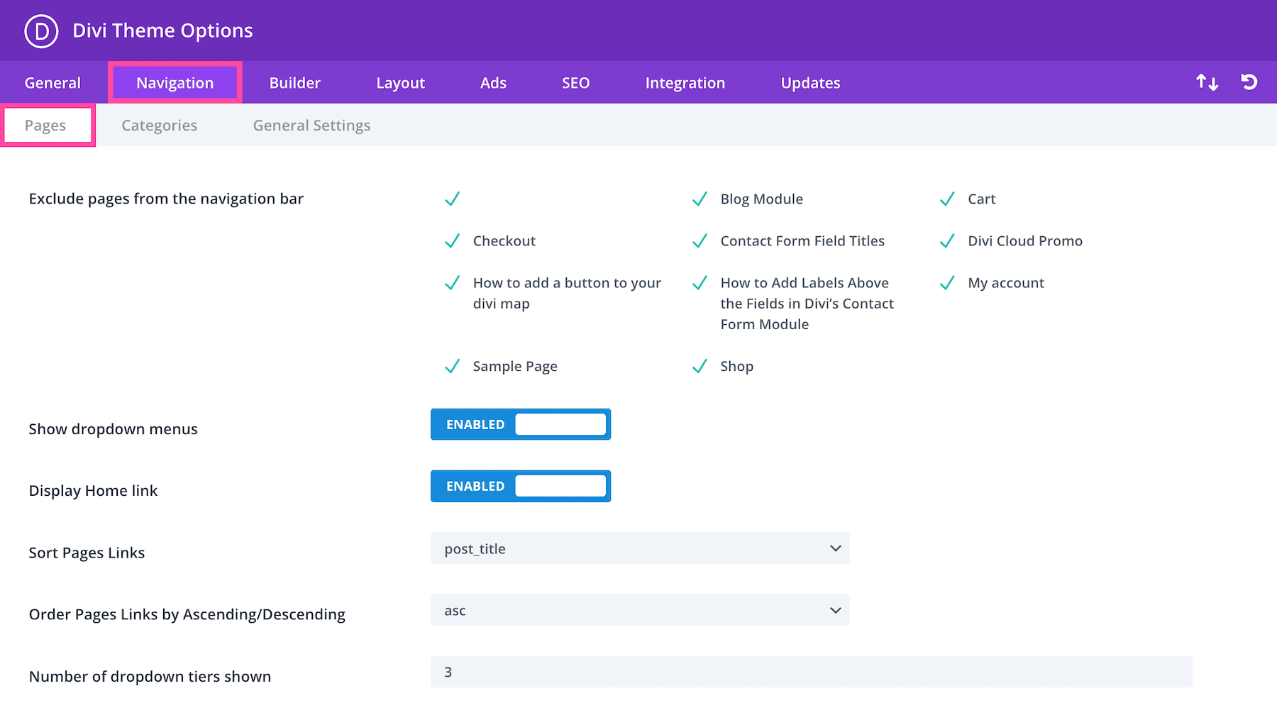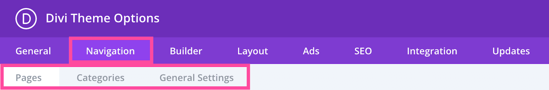 In the Navigation tab, you’ll see three sub-tabs: Pages, Categories, and General Settings.