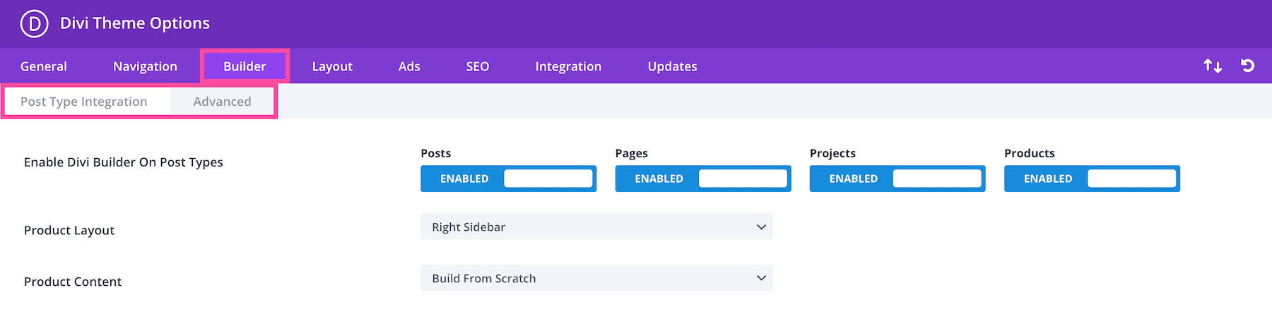 In the Builder tab, you’ll see two sub-tabs: Post Type Integration and Advanced.