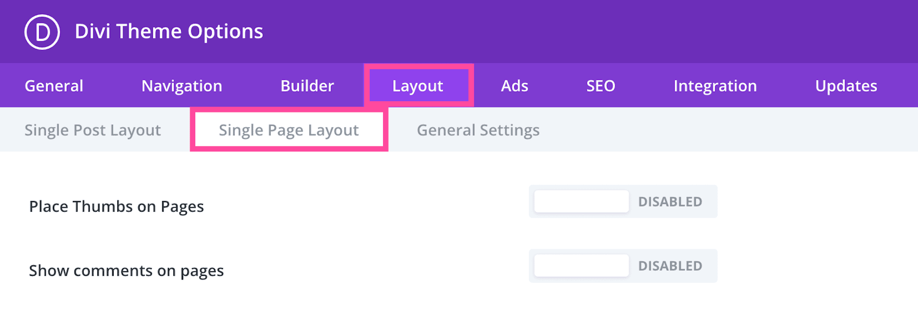 In the Layout tab, you’ll see three sub-tabs: Single Post Layout, Single Page Layout, and General Settings.
