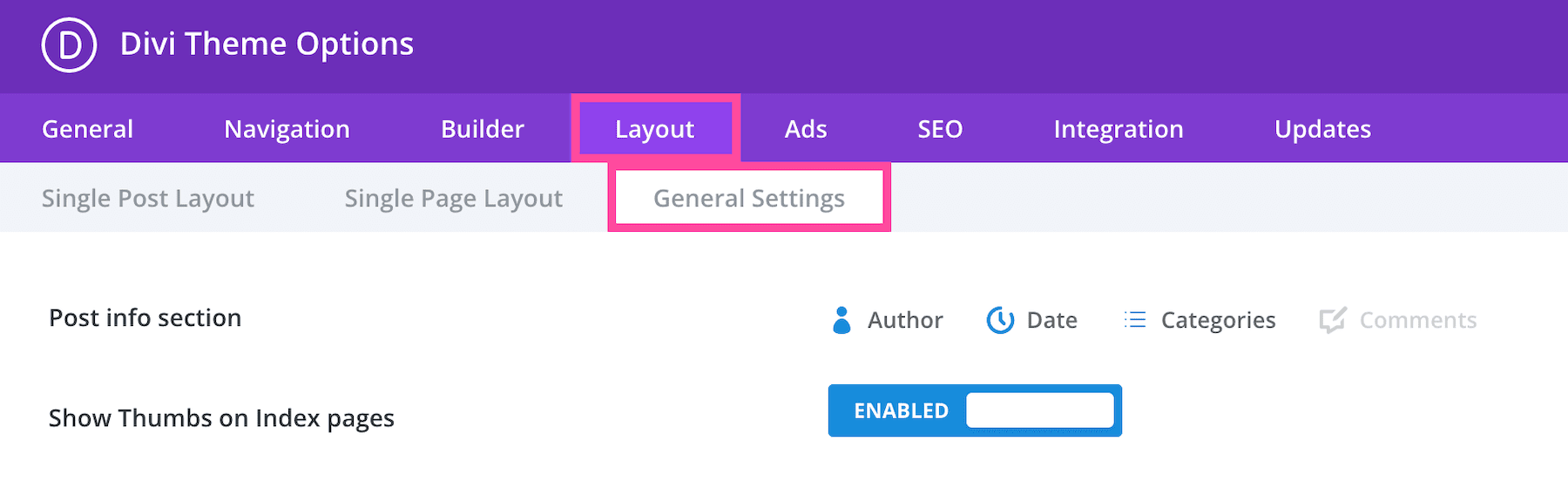 In the General Settings sub-tab, you’ll find settings for post info section, and showing or hiding thumbs on index pages.