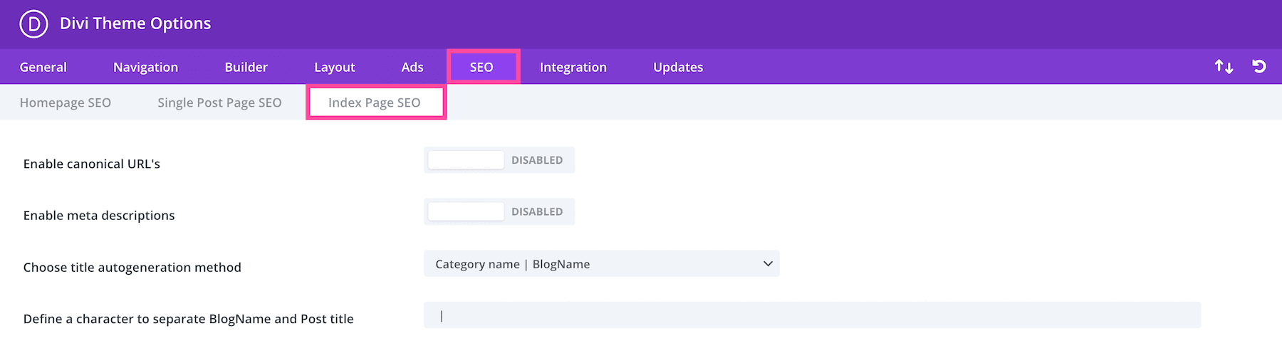 In the Index Page SEO sub-tab, you’ll find settings for enabling canonical URLs, meta descriptions and more.