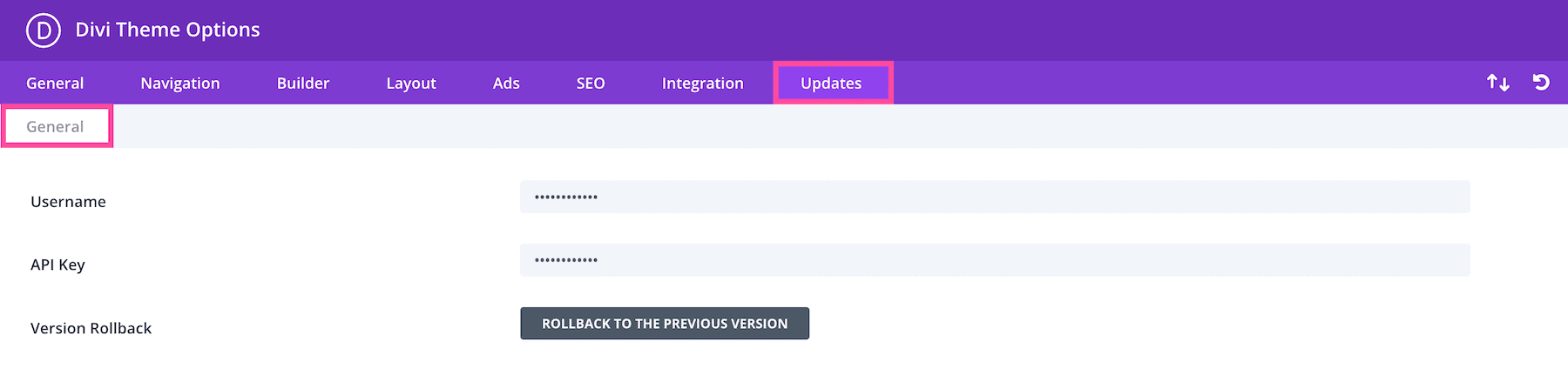 The updates tab is where you’ll paste your Elegant Themes membership info so that your Divi install is linked to your ET account, ensuring you have access to all future updates and features of Divi.