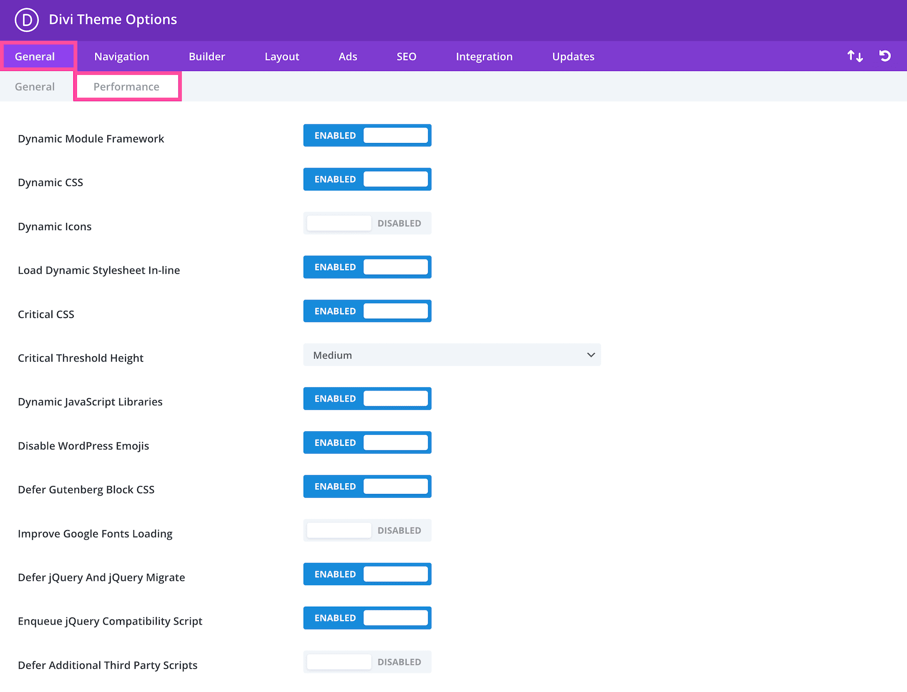 Under the Performance sub-tab, you’ll find settings that control CSS and Javascript that can be used to optimize your site’s performance. Settings like Dynamic Module Framework, Dynamic CSS, Critical CSS, Dynamic JavaScript Libraries, and more can help improve the speed of your website.