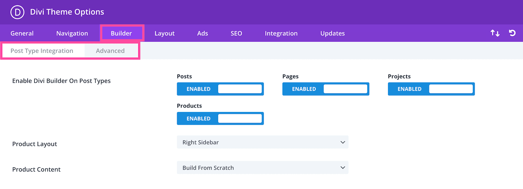 In the Post Type Integration sub-tab, you’ll see the setting Enable Divi Builder On Post Types, Product Layout, and Product Content.