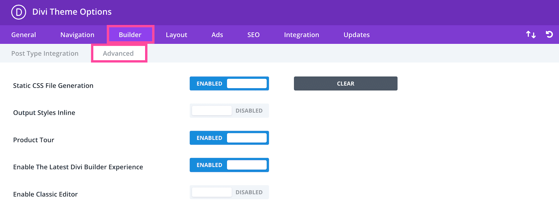 In the Advanced sub-tab, you’ll see settings the settings Static CSS File Generation, Output Styles Inline, Product Tour, Enable the Latest Divi Builder Experience, and Enable the Classic Editor.