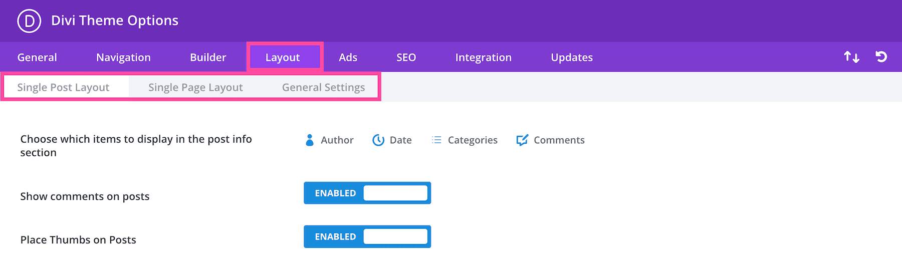 In the Single Post Layout sub-tab, you’ll see the settings for choosing what information to display in the post info section, showing or hiding comments on posts, and placing thumbnails on posts.