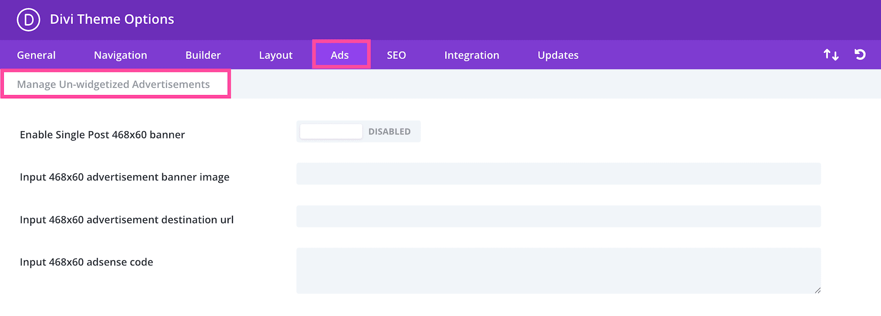 In the Ads tab, you’ll find settings that configure ads displayed on your website that are not configured through widgets.