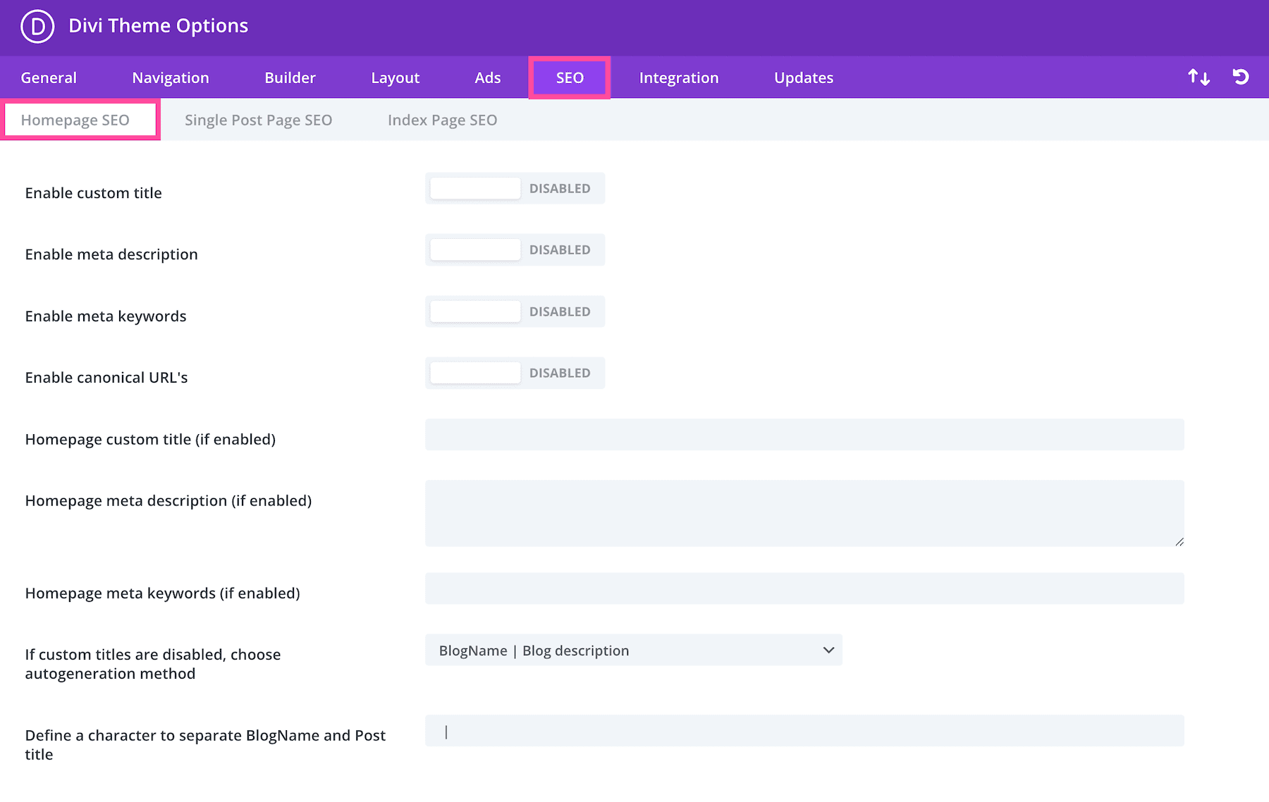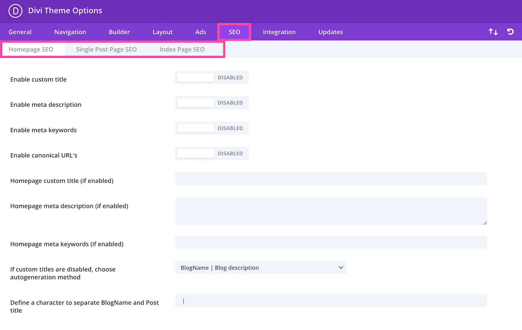 In the SEO tab, you’ll find three sub-tabs: Homepage SEO, Single Post SEO, and Index Page SEO.